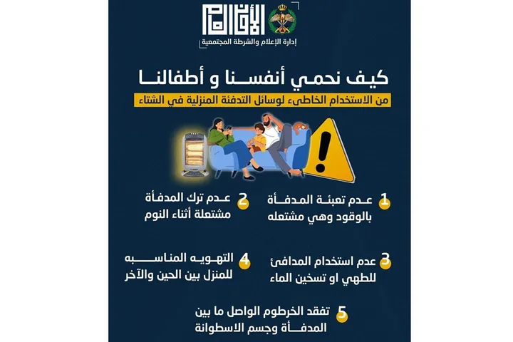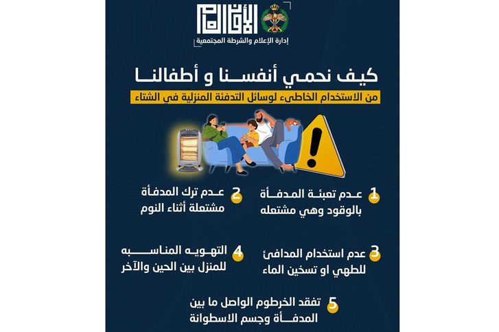 وفي جانب آخر، حذرت المديرية من مخاطر ترك المدافئ مشتعلة في أثناء النوم أو عند مغادرة المنزل، مشيرة كذلك إلى خطورة اقتراب الأطفال منها، ما يستوجب مراقبتهم وإبعادهم عن مصادر الحرارة.