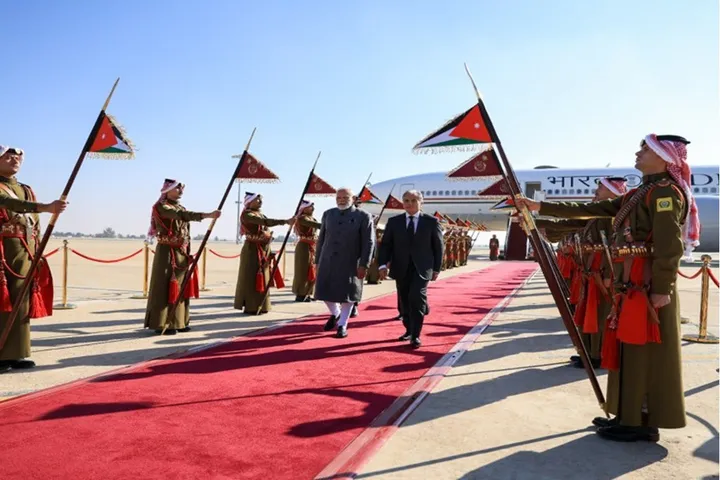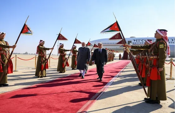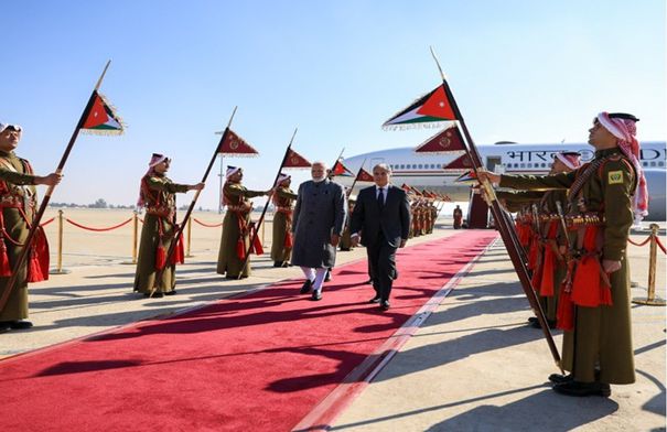 وجرت للضَّيف مراسم استقبال رسميَّة لدى وصوله مطار الملكة علياء الدَّولي، حيث اصطفّ حرس الشرف لتحيَّته، وعزفت الموسيقى السَّلامين الجمهوري الهندي والملكي الأردني.