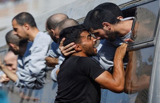 ووصلت حافلات الأسرى الفلسطينيين المفرج عنهم من السجون الإسرائيلية إلى مجمع ناصر الطبي في خان يونس.