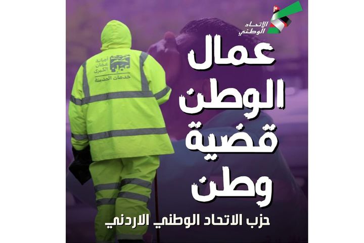 خامسًا: يجدد حزب الاتحاد الوطني الأردني التزامه الكامل بالوقوف إلى جانب الطبقة العاملة في المملكة، والدفاع عن حقوقها ومكتسباتها ضمن الأطر الدستورية والقانونية، إيمانًا بأن كرامة العامل هي جزء لا يتجزأ من كرامة الوطن.