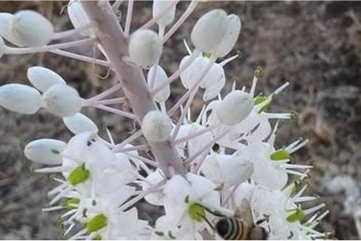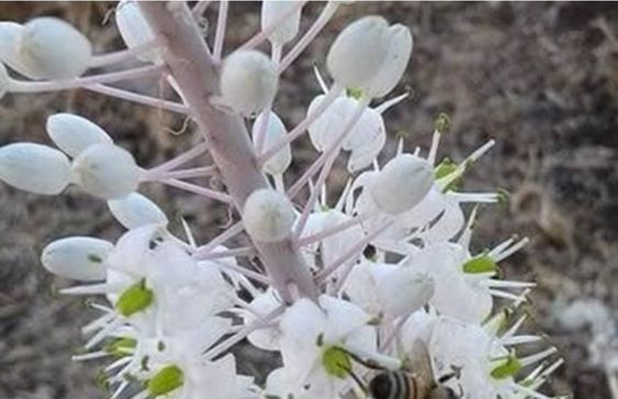 يبلغ طول النبات حوالي نصف متر، ويخرج منه عود بطول متر واحد يحمل أزهارا بيضاء.