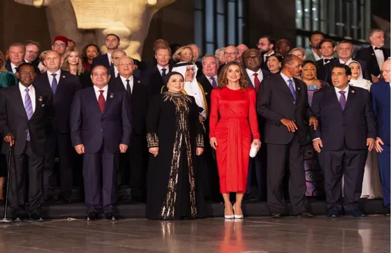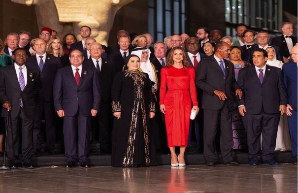 ولدى وصول جلالة الملكة وسمو الأميرة سلمى للمتحف، كان في استقبالهما الرئيس المصري عبد الفتاح السيسي وعقيلته السيدة انتصار السيسي.