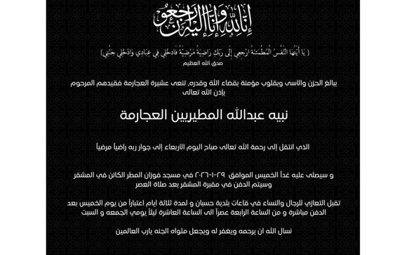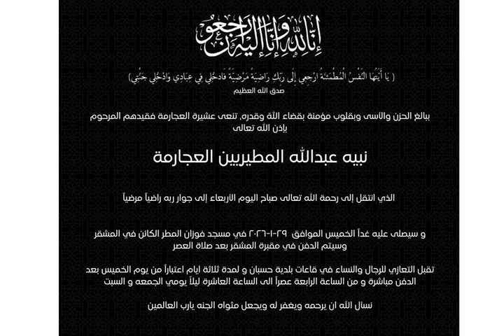 وسيتم دفن جثمانه الطاهر يوم الخميس الموافق ٢٩-١-٢٠٢٦ في مقبرة المشقر