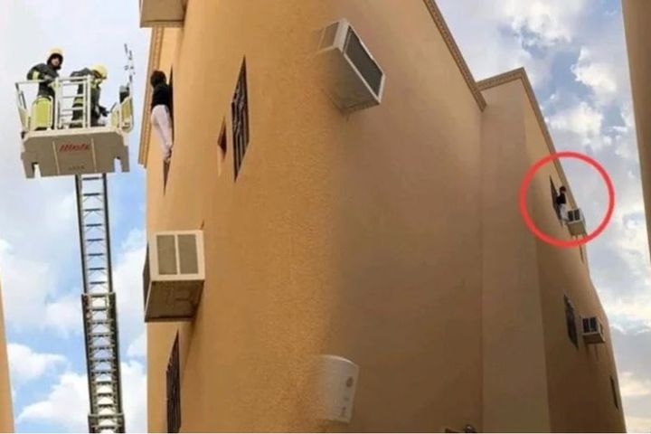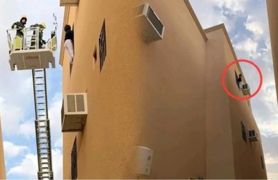 عند وصول فرق الدفاع المدني وجدوا ام الطفل داخل الغرفة ممسكه بالطفل حتى لا يقع ولم تستطع حتى الاتصال وطلب المساعده