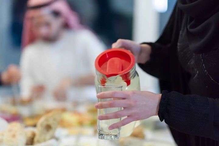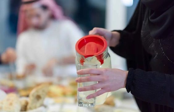 للحفاظ على ترطيب الجسم خلال الصيام، يُنصح بتوزيع كمية الماء اليومية المطلوبة (حوالي 8–10 أكواب) بمعدل كوب واحد كل ساعة تقريبًا من الإفطار وحتى السحور.
