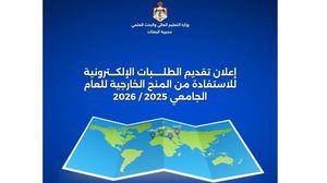 الوكيل الإخباري- تعلن مديرية البعثات في وزارة التعليم العالي والبحث العلمي للطلبة الحاصلين على شهادة الثانوية العامة الأردنية والذين حققوا متطلبات النجاح للالتحاق بالجامعات لأول مرة في الدورتين الصيفية (العامة) للعام 2025 والتكميلية للعام 2024 في الفرع العلمي والفرع العلمي /الحقل الطبي ، أو ما يعادلها (شهادات الثانوية العامة العربية أو الأجنبية) من داخل المملكة أو خارجها للعام الدراسي 2025 فقط بمعدل لا يقل عن 90%، والراغبين بالاستفادة من المنح الخارجية المقدمة للمملكة ضمن إطار التبادل الثقافي مع الدول العربية الشقيقة والأجنبية الصديقة بأن عملية تقديم الطلبات الإلكترونية للاستفادة من المنح الخارجية للعام الجامعي 2025-2026 ستبدأ اعتباراً من صباح يوم الاربعاء الموافق 3-9-2025 ولغاية الساعة 12 ليلاً من يوم الأحد الموافق 7-9-2025، وذلك من خلال الموقع الإلكتروني لمديرية البعثات على الرابط الآتي: www.dsamohe.gov.jo