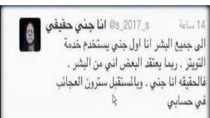 وكتب 'أنا جني حقيقي' تغريدة يقول فيها 'إلى جميع البشر أنا جني حقيقي استخدم تويتر، ربما اعتقد البعض إني من البشر.. فالحقيقة أنا جني.. وبالمستقبل القريب سترون العجائب على حسابي'.
